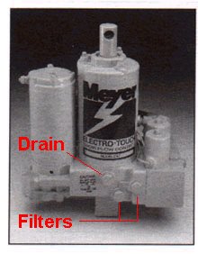 THE NUTS HOLDING THE COILS ON, SHOULD BE REPLACED WITH BRASS NUTS. NEVER SEIZE SHOULD BE APPLIED TO THE THREADS TOO. THIS REDUCES THE RISK OF SNAPPING THE STUDS WHEN REMOVING THE NUTS TO SERVICE THE COILS. ON THIS MEYER E-47 PUMP, THE "A" COIL CONTROLS LOWER, AND THE "B" CONTROLS RAISE, AND THE "C" CONTROLS RIGHT ANGLE. THERE IS NO VALVE USED TO ANGLE THE PLOW LEFT.