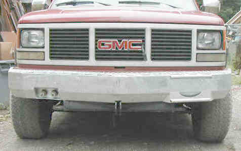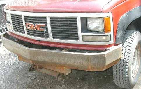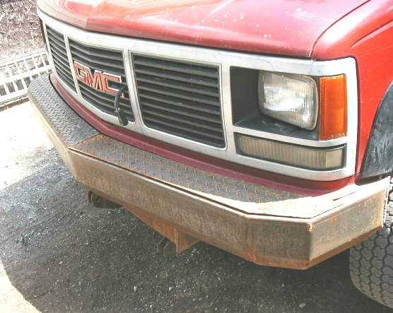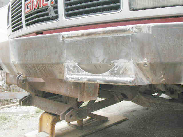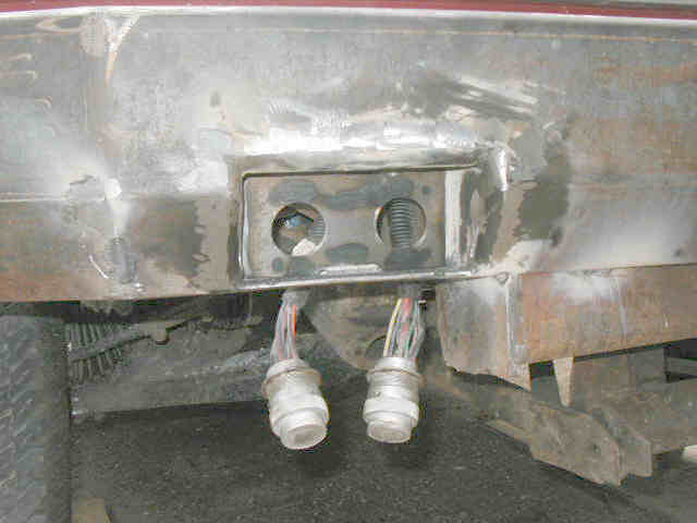 I wanted to recess the plugs for the Sno-Way vee plow so they would not be so likely to get wiped off. I cut in this "picture frame" to accomplish that. It doesn't show here but the top and sides of the opening are radiused. I did that with split sections of 1" Sch. 80 pipe. Wall thickness is right around 3/16" so it matched the bumper itself as well as the plate I used for the sides. The back plate is 1/8" and a 1 3/4" hole saw made short work of the holes for the plugs. You can see some heat bluing around the holes where I welded 1/4" square stock to trap the flats on the back of the plow plugs. This was necessary as there is no way to access the rear flange of the plug to hold them when they are tightened in place. There is a slight gap at the bottom of the rear plate to allow water to drain as the bottom tilts slightly to the rear.