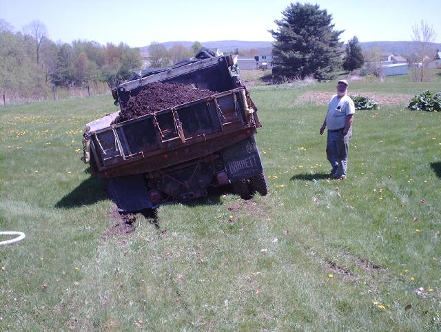 Alan went to deliver a load of top soil. He didn't realize that the customer had just drained their swimming pool across the lawn....