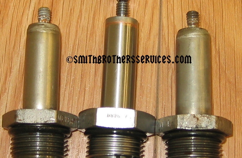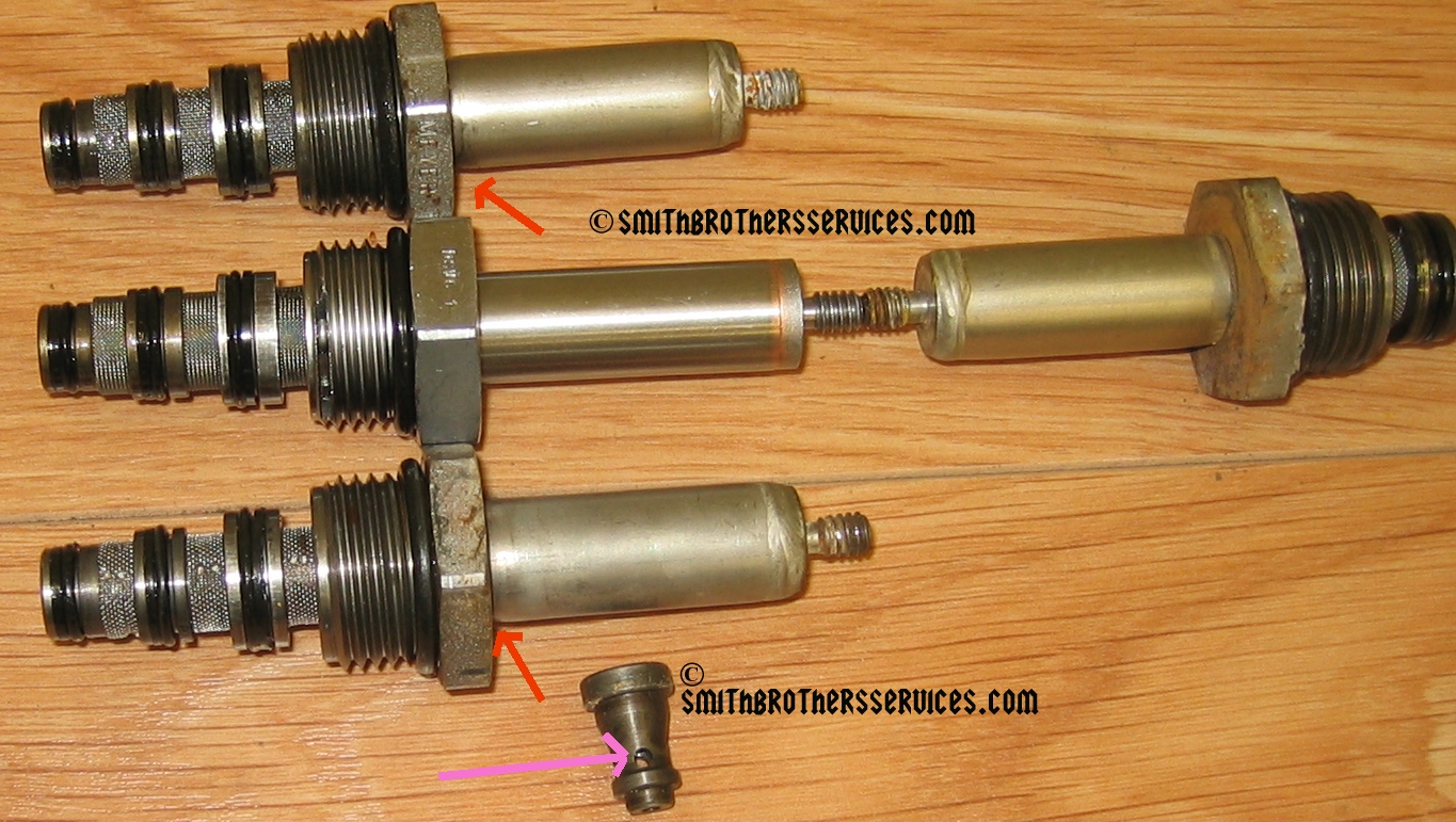 How does the C Valve get swollen? Only one way, hitting something way to hard, way too fast. The fluid in the extended Angle Cylinder goes through the Crossover Relief Valve and then travels to the other Angle Ram, extending it. It helps absorb the hit. The orifices in the Crossover Valve are small, and the fluid can't get through fast enough on a hard, fast hit, so the fluid spikes up into the C Valve, swelling it. It only takes one time to do it. There is no other way for it to happen. It is a pretty common problem with commercial use plows that have numerous drivers, or drivers in a hurry to get the job done, or drivers that ram frozen snow banks trying to move them. Speed + Plowing = Failure/Damage. It's that simple. Below are two photos of some swollen C Valves. The Red Arrows are pointing to the bases, where you can see the bulge starting. The Valve in the center is an new aftermarket one, but you can see how uniform the diameter of it is. You can click on either photo for a close up look. The Purple arrows is pointing to the small orifices in the Crossover Relief Valve that the fluid must flow through to get from one Angle Ram to the other.