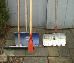 Here's some hand tools. You can see 2 snow "pushers". Also, a squeegee, and a "Mutt". The Mutt is the chisel looking tool. Great for getting under ice, and for chopping. It also is handy for cutting sod, and roots when digging.