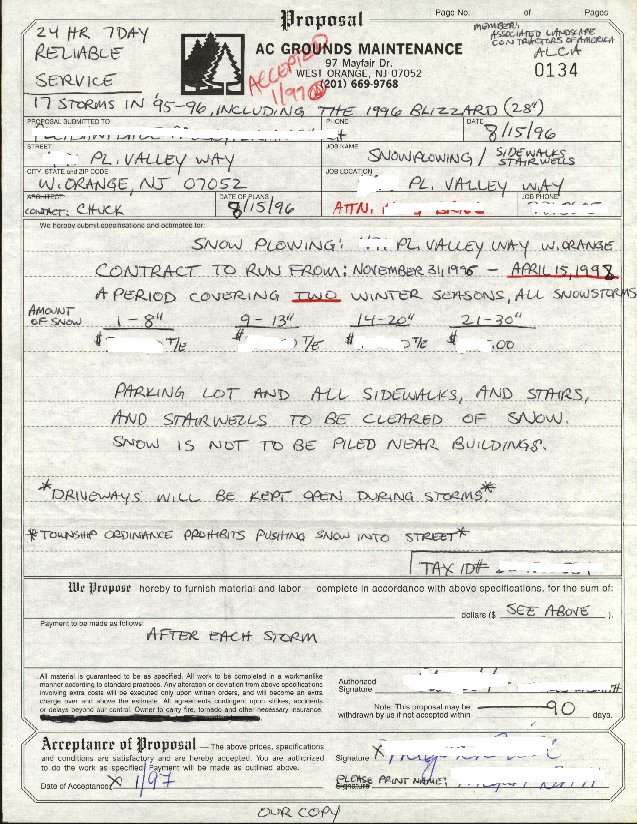 Here I have put up three "sample" contracts. These are from a few years back. I want to stress that these contracts worked for *me* at the time. They are not perfect. They might not be perfect for you, and in fact, shouldn't be. I am putting them here merely to give you an idea of some of the things you should include on your contracts. I purchased these contracts from NEBS. I ordered them as "3 part" forms. That means the original contract is three "carbonless" pages. When I would write up the contract, there would be three copies of it. I would tear out the "pink" copy, and save it for my records. The other two copies went out to the customer. The customer would then sign and return the original top copy (white), and keep the other (yellow) copy for their records. By saving the pink copy, if the customer had any questions, or wanted any revisions, I still had a copy of what I sent them, for reference. All of these samples are from before I joined SIMA and found out all the things that should really be in a contract of this type. When making your own contract, it is best to view as many other contracts as you can, take what parts apply to you from all of them, and come up with your own contract. Again, these are my personal contracts. You can find other examples of contracts on the SIMA website, in the Members Area, if you are a SIMA member.