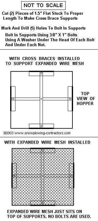 This is a somewhat simple cure for problems with single stage tailgate spreaders due to clumps in the de-icer being spread. Installing a screen will stop the clumps from getting down to the auger, and clogging the spreader. The screen should be installed about 3" down from the top of the spreader. This will make it easy to break up clumps, and ensure you can get to the clumps. If you were to install the screen lower in the spreader, it would be completely covered with the material being spread, and make it much harder to see clumps, and reach them to break them up. For the screen itself, I suggest using a piece of expanded wire mesh, with 1" diamond shaped holes. If I am not mistaken, the thickness of the mesh should be about #13. I cannot remember if thickness of expanded wire mesh is measured by number, or by gauge. If memory serves me correctly, it is measured by number. With that said, lets move on to some diagrams. At any rate, the mesh should be thick enough to prevent it from bending.