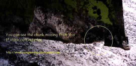 You can see the damage from plowing roads on this plow. The cutting edge is very worn down, and should have been replaced already. You can see the chunk missing. I can only assume it takes hitting something very hard, to break a piece off of a 1" thick cutting edge.
